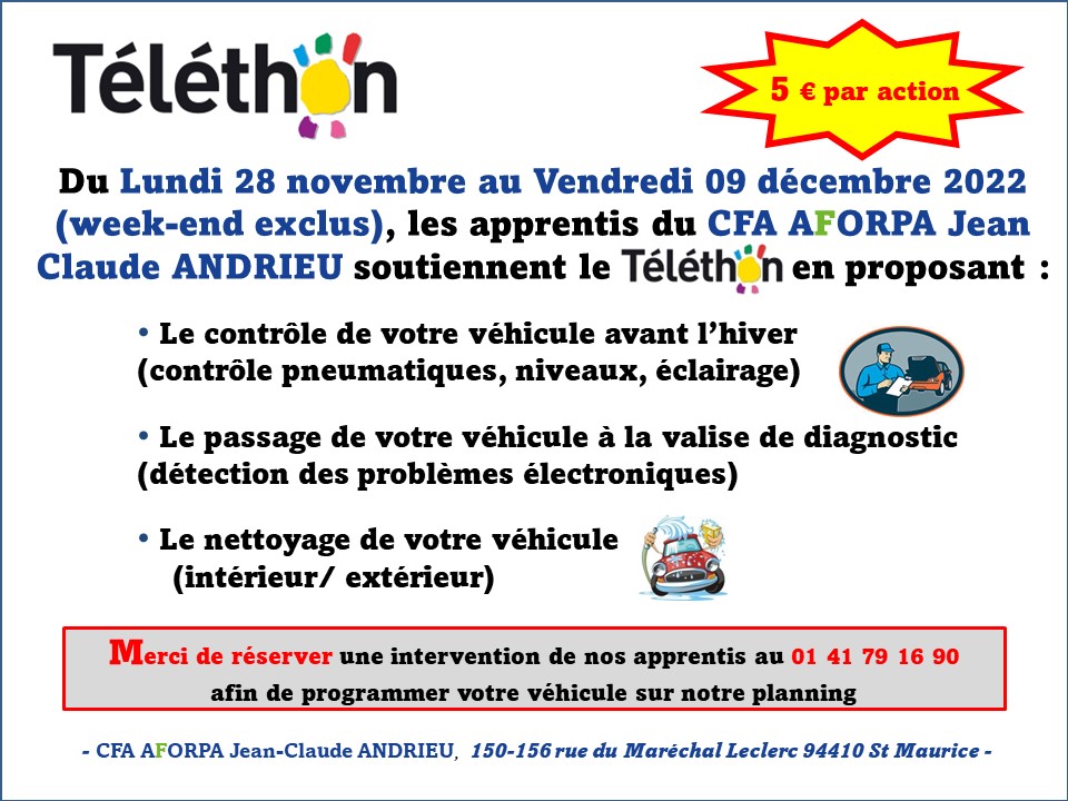 Les apprentis du CFA AFORPA de Saint-Maurice (94) proposent des interventions du 29/11/21 au 10/12/21 pour soutenir le TÉLÉTHON 2021
